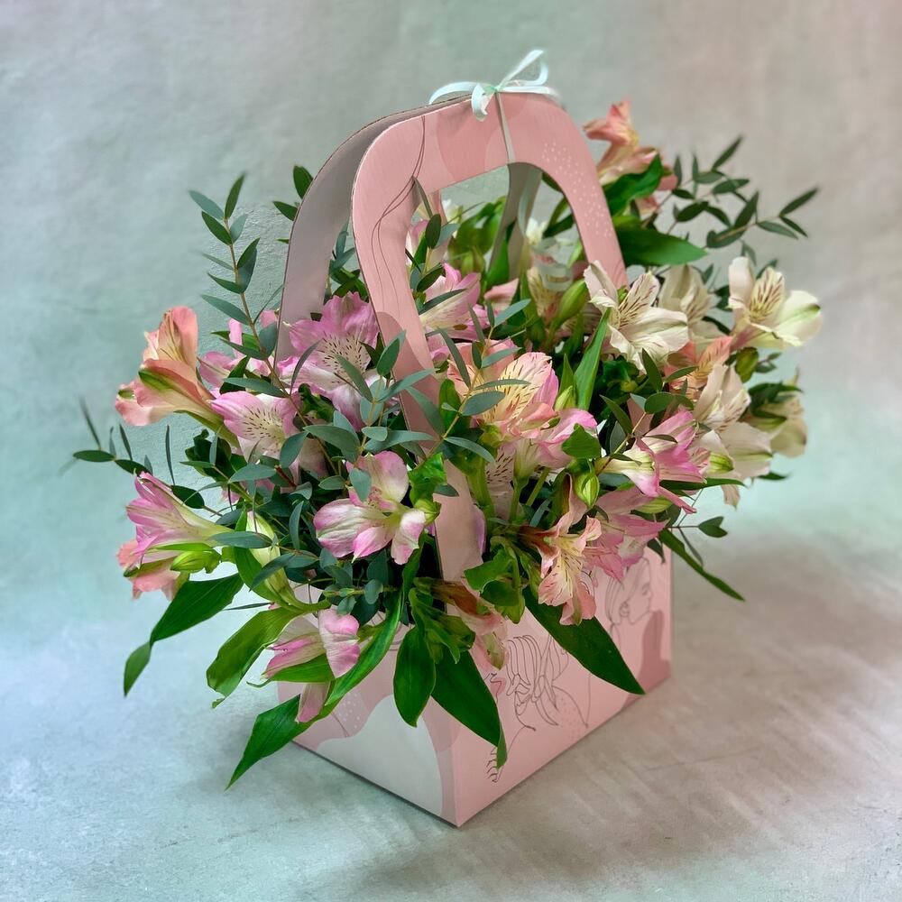 Коробка с альстромерией и зеленью