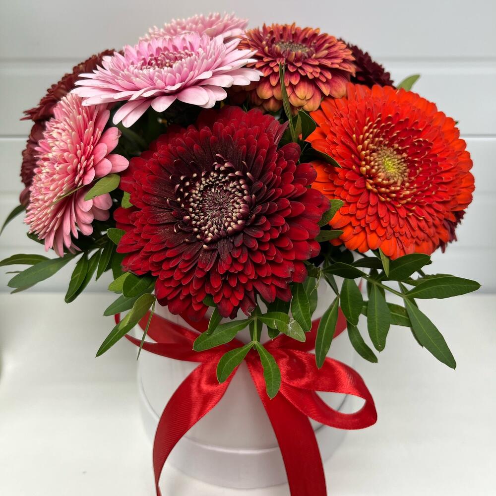 Гербера – 9 шт.Коробка шляпная – 1 шт.