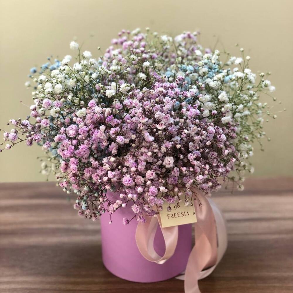 Цветная гипсофила в шляпной коробке