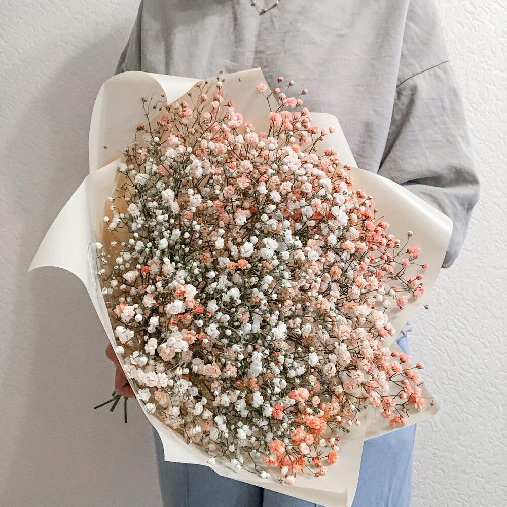 Гипсофила – 3 шт.гипсофила цветная – 4 шт.Пленка корейская – 2 шт.Лента атласная – 1 шт.