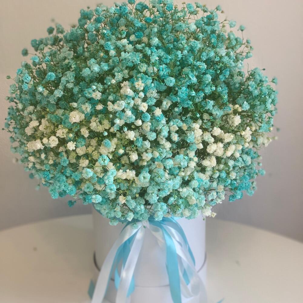Гипсофила – 9 шт.Шляпная коробка с лентами – 1 шт.Оазис флористический – 1 шт.