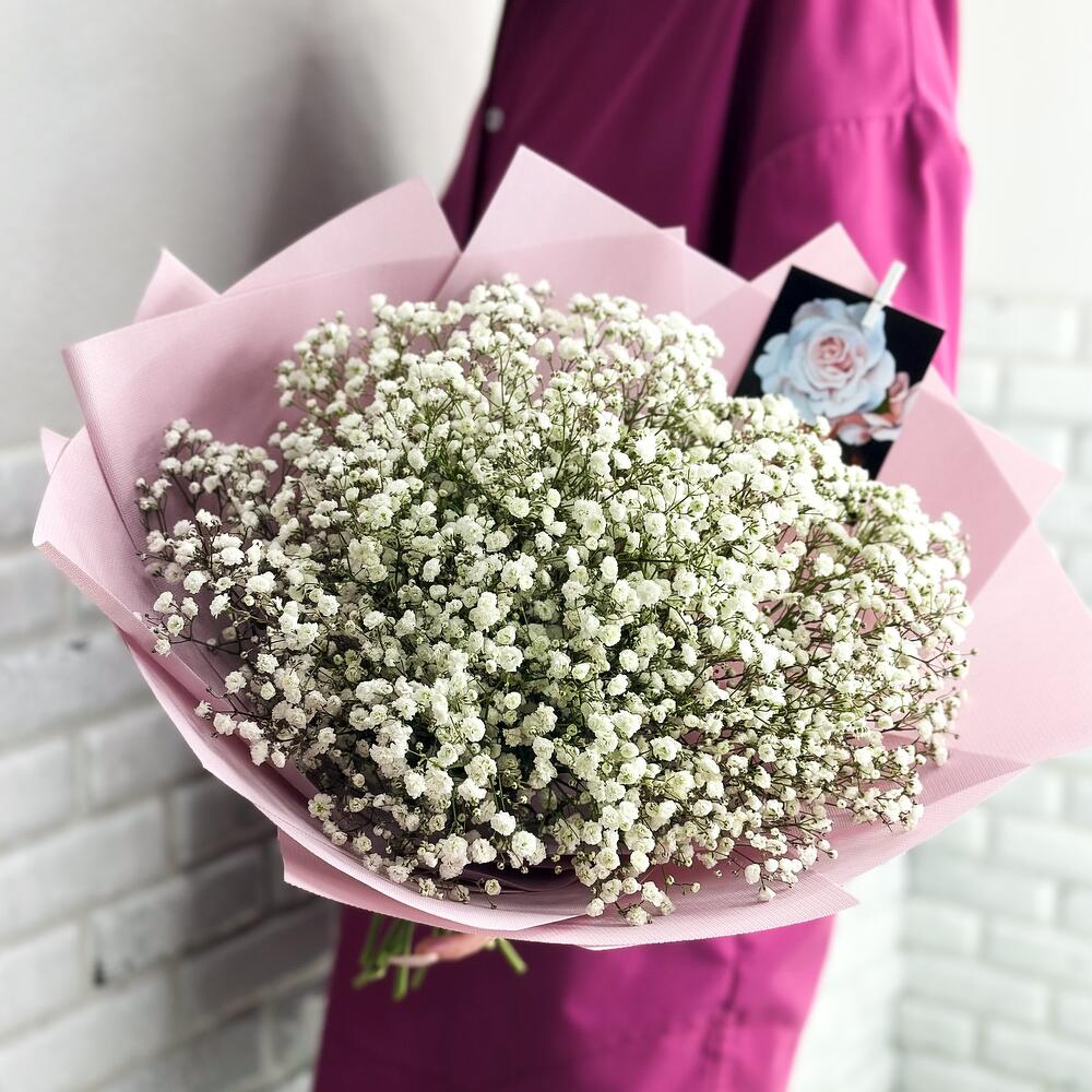 Открыточка с вашими пожеланиями – 1 шт.Средство для продления жизни цветов – 1 шт.гипсофила белая – 9 шт.инструкция по уходу за цветами – 1 шт.упаковка зефирка – 3 шт.