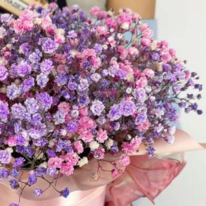 Лента – 1 шт.Пленка – 1 шт.Оазис – 1 шт.Наклейка – 1 шт.гипсофила радужная – 3 шт.коробка 12х12 – 1 шт.
