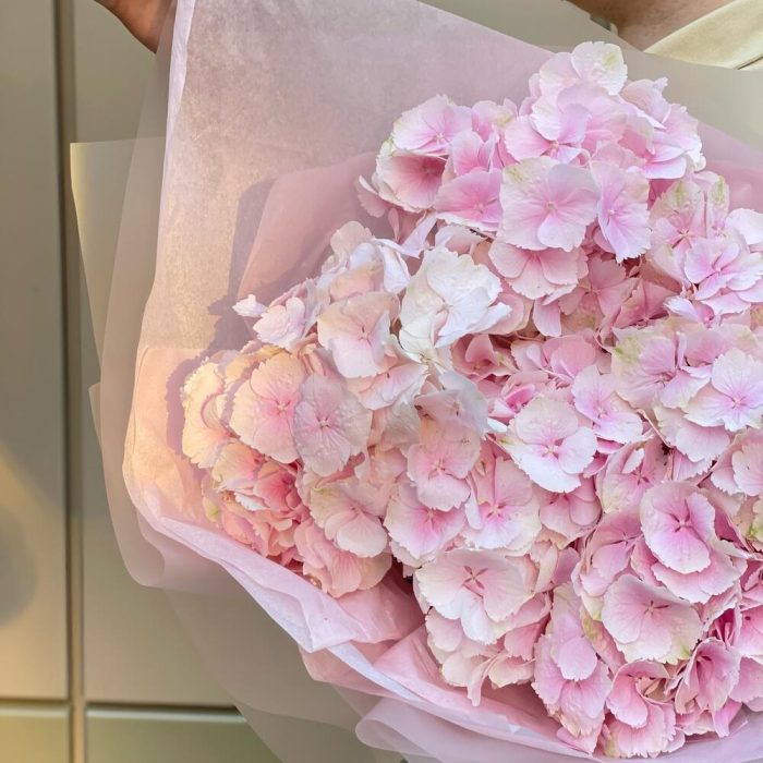 Лента атласная – 2 шт.Тишью – 2 шт.Упаковка дизайнерская – 4 шт.Гортензия розовая – 5 шт.