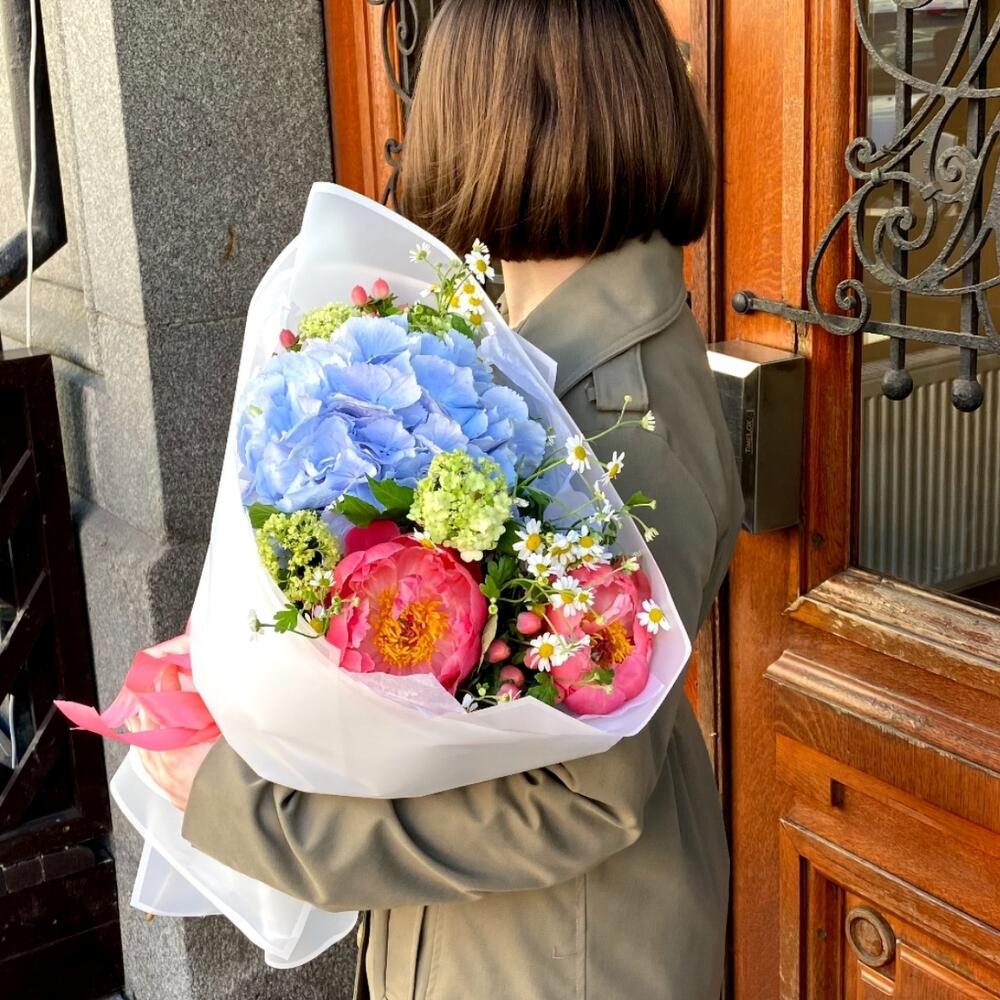 Яркий, сочный летний букет, созданный из невероятных пионов гортензии, вибурнума, ягодок и ваксфлауэра!Такой букет точно понравится яркой и энергичной получательнице, и будет долго радовать её.К букету прилагается открытка с вашими пожеланиями, инструкцию по уходу за цветами и приятный комплимент от нашего магазина – шоколадка.Мы также будем рады отправить вместе с букетом конфеты, шоколад ручной работы или б/а вино по вашим пожеланиям, просто напишите нам в личные сообщения. Заказывая наш букет, Вы всегда получите исключительный сервис и заботу о клиенте