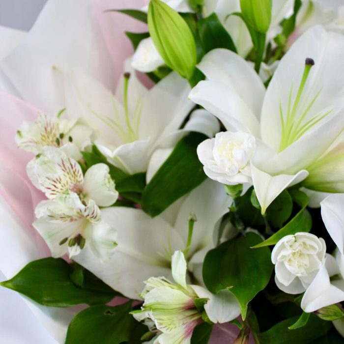 Альстромерия – 3 шт.Лилия – 2 шт.Рускус – 1 шт.Гвоздика кустовая – 4 шт.Упаковка дизайнерская – 3 шт.