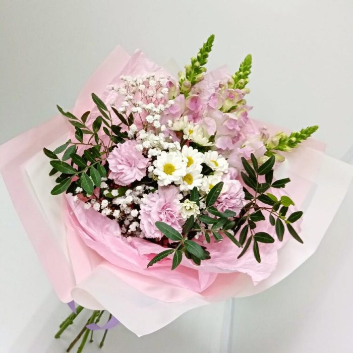 Антуриум – 3 шт.Гипсофила – 1 шт.Сантини – 1 шт.Дизайнерская упаковка – 1 шт.зелень фисташки – 1 шт.диантусы – 3 шт.