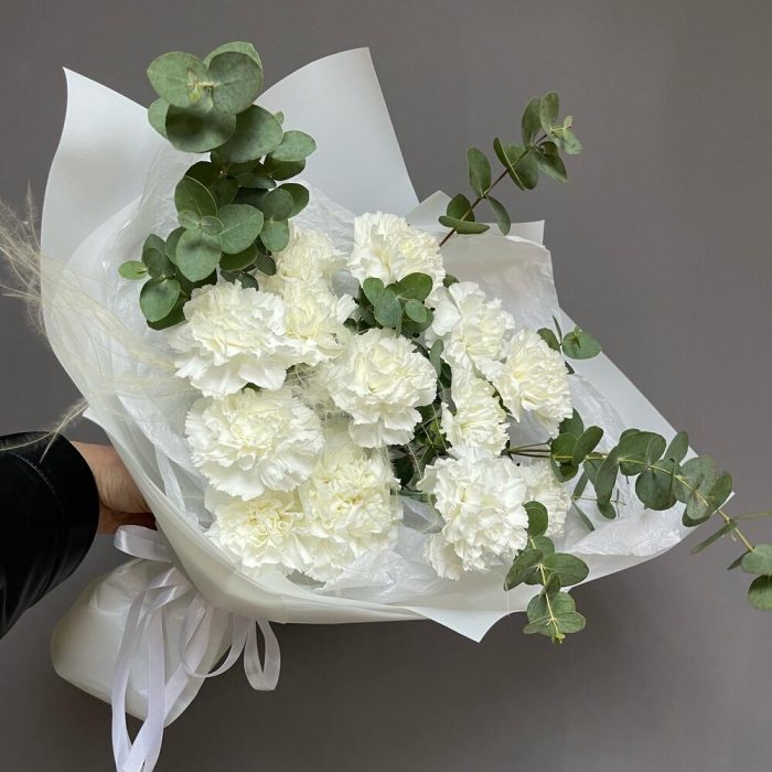 Эвкалипт – 3 шт.Гвоздика сортовая – 13 шт.Упаковка дизайнерская – 1 шт.ковыль сухоцвет – 1 шт.