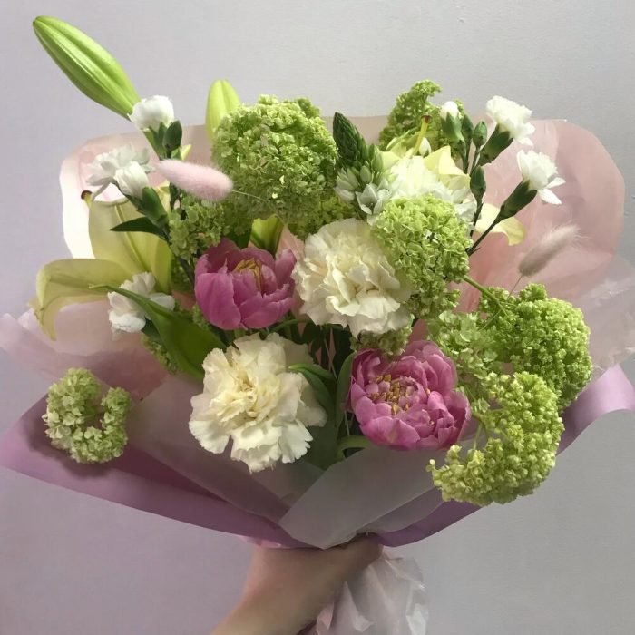 Лилия – 3 шт.Вибурнум – 3 шт.Орнитогалум – 1 шт.Тюльпан пионовидный – 2 шт.Гвоздика кустовая – 2 шт.Лагурус – 2 шт.Упаковка дизайнерская – 1 шт.Лента атласная – 1 шт.Открыточка с вашими пожеланиями – 1 шт.