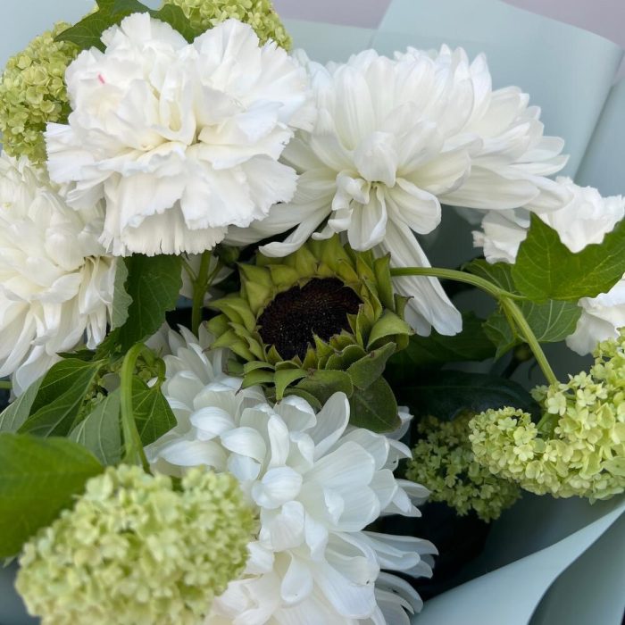 Хризантема Антонов – 3 шт.Вибурнум – 2 шт.Подсолнух – 1 шт.Диантус – 4 шт.Пленка дизайнерская – 1 шт.Лента – 1 шт.