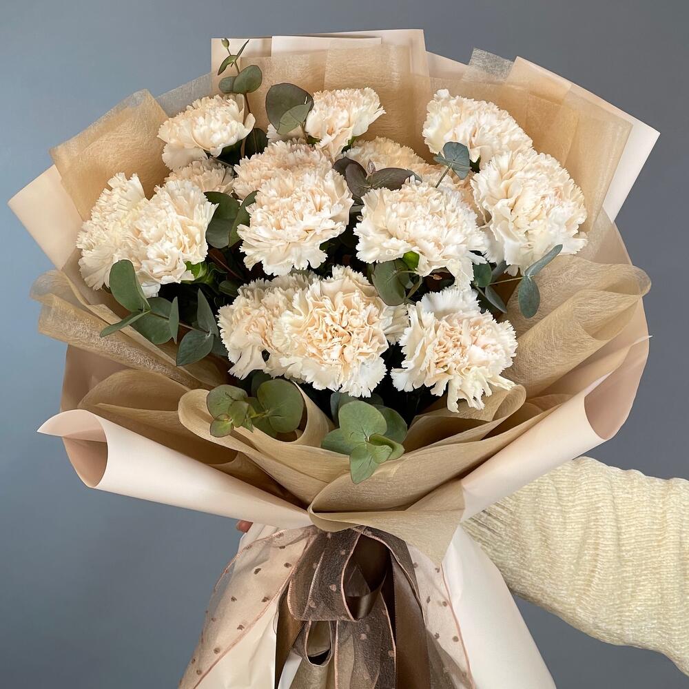Лента – 2 шт.Эвкалипт – 2 шт.Гвоздика – 15 шт.Упаковка дизайнерская – 2 шт.