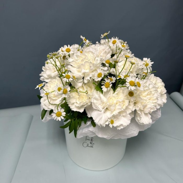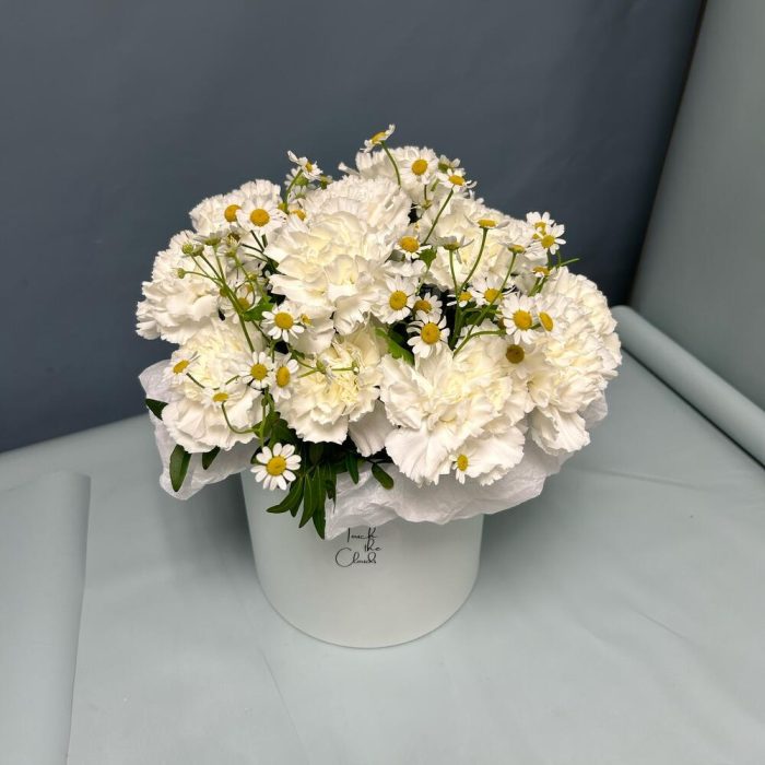 Цветочная композиция в коробке с ромашками и гвоздиками