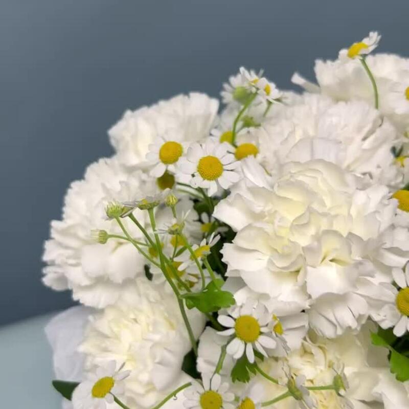 Гвоздика – 15 шт.Тишью – 1 шт.Матрикария – 2 шт.Коробка – 1 шт.Оазис флористический – 1 шт.