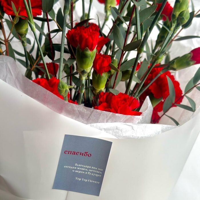 Кустовые красные гвоздики с эвкалиптом к 9 мая