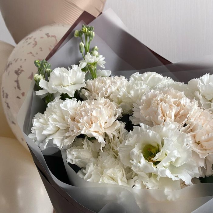 Маттиола – 3 шт.Эвкалипт – 2 шт.Эустома – 3 шт.Диантус – 11 шт.сердце крем сатин – 2 шт.латекс песочный – 4 шт.хром розовое золото – 3 шт.шар в шаре песочный с конфетти розовое золото – 2 шт.