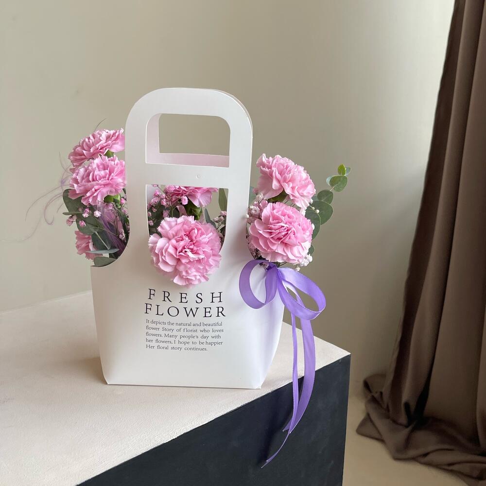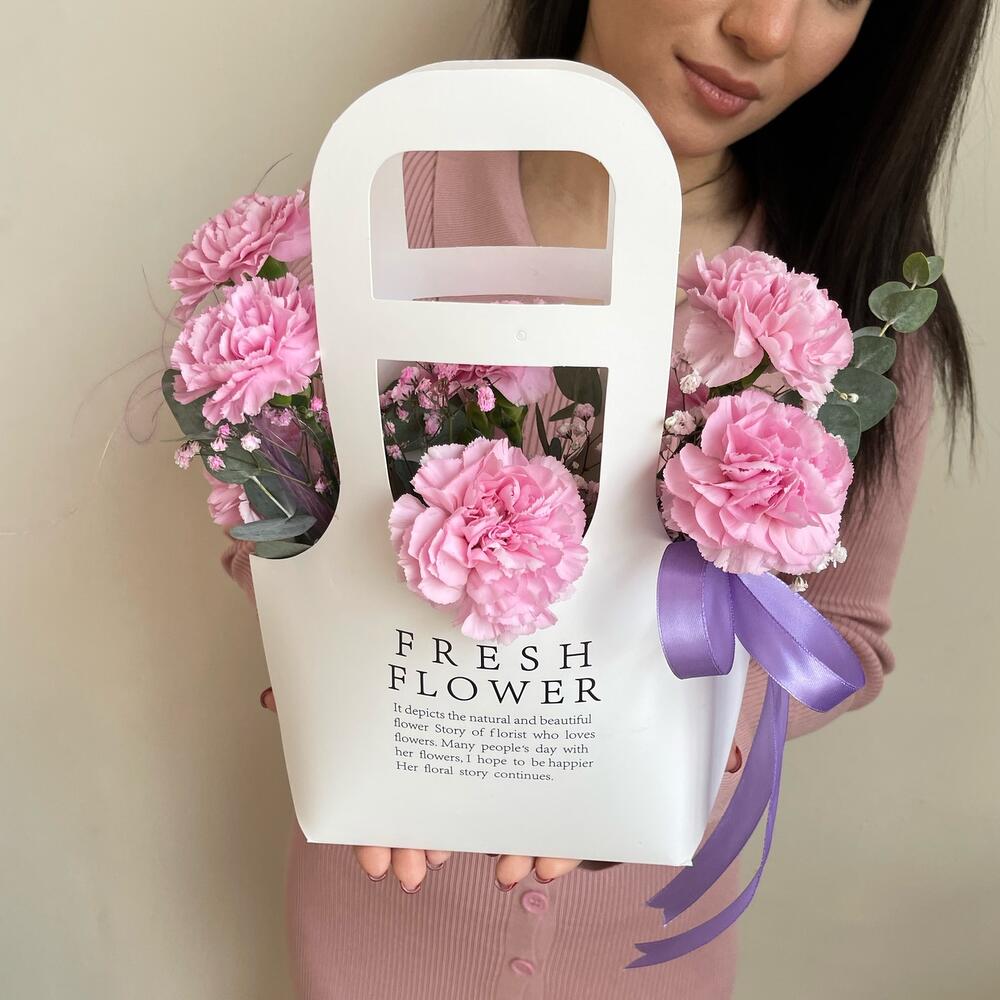 Эвкалипт – 1 шт.Лента атласная – 1 шт.Диантус – 9 шт.Ковыль – 1 шт.Оазис флористический – 1 шт.Пакет для цветов – 1 шт.