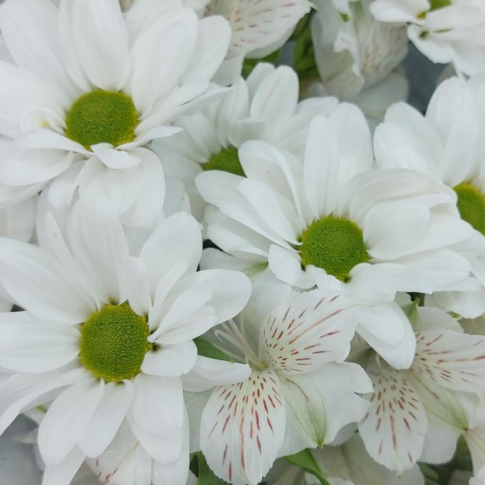 Стойкий букет из ромашковых хризантем и альстромерий. Такой букет всегда уместен и подойдёт для любого повода: День Рождения, именины, годовщина свадьбы, рождение ребенка, 8 марта, День Святого Валентина, выпускной и т.д. Можно вручить маме, сестре, подруге, коллеге, учителю, любимой.