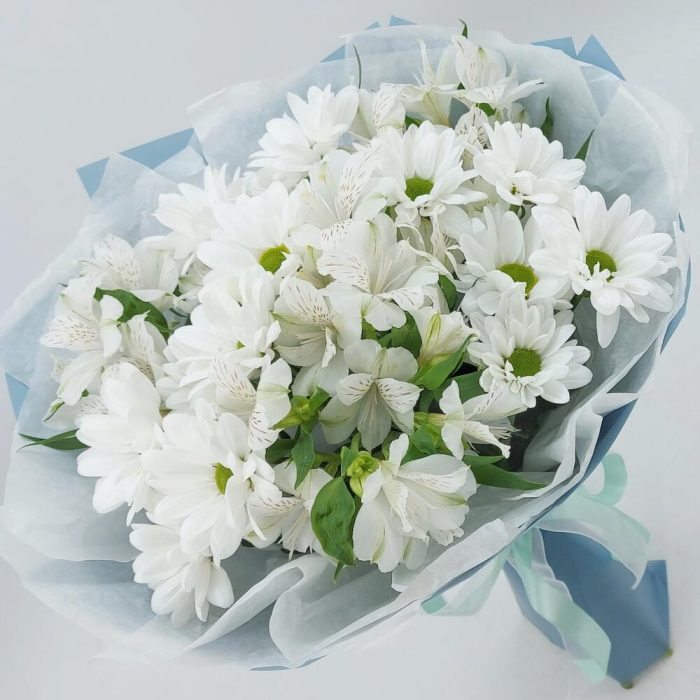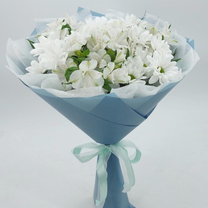 Хризантема Кустовая Бакарди белая – 3 шт. Альстромерия – 4 шт. Упаковка дизайнерская – 1 шт.