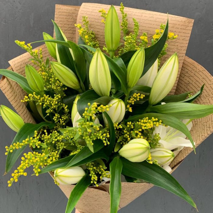 Лилия – 5 шт.Солидаго – 3 шт.Упаковка дизайнерская – 2 шт.Лента атласная – 2 шт.