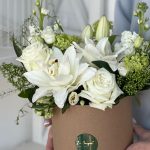 Вибурнум – 3 шт.Лизиантус – 4 шт.Маттиола – 2 шт.Шляпная коробка – 1 шт.Скиммия – 3 шт.Гринбелл – 2 шт.Оазис флористический – 1 шт.лилия дабл – 2 шт.