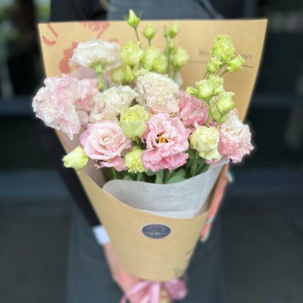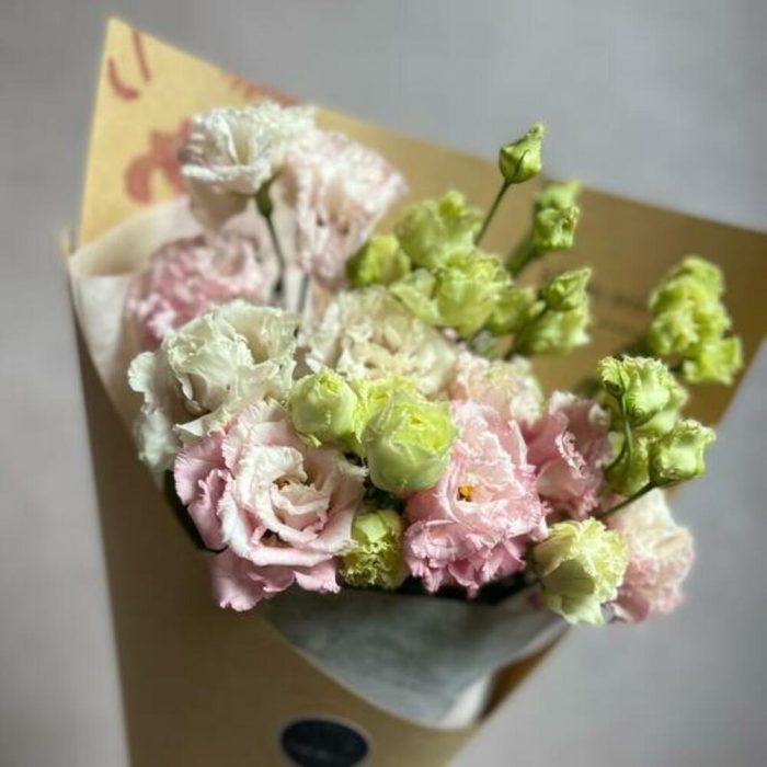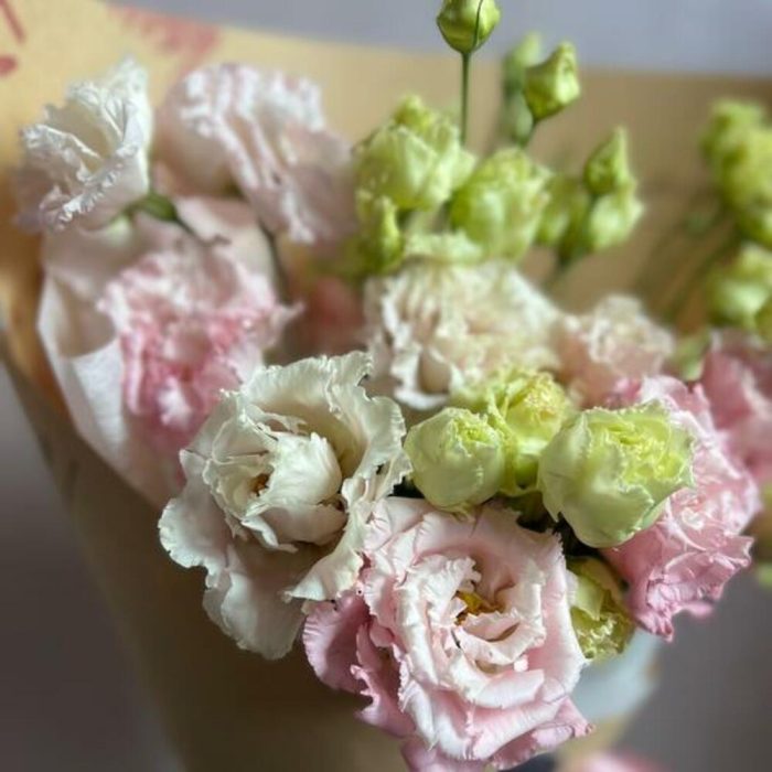 Лизиантус (эустома) – 7 шт.декоративная упаковка – 1 шт.Атласная лента – 1 шт.
