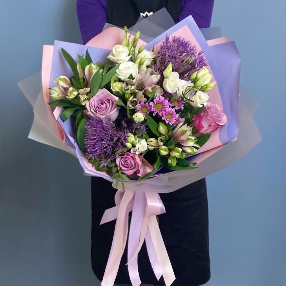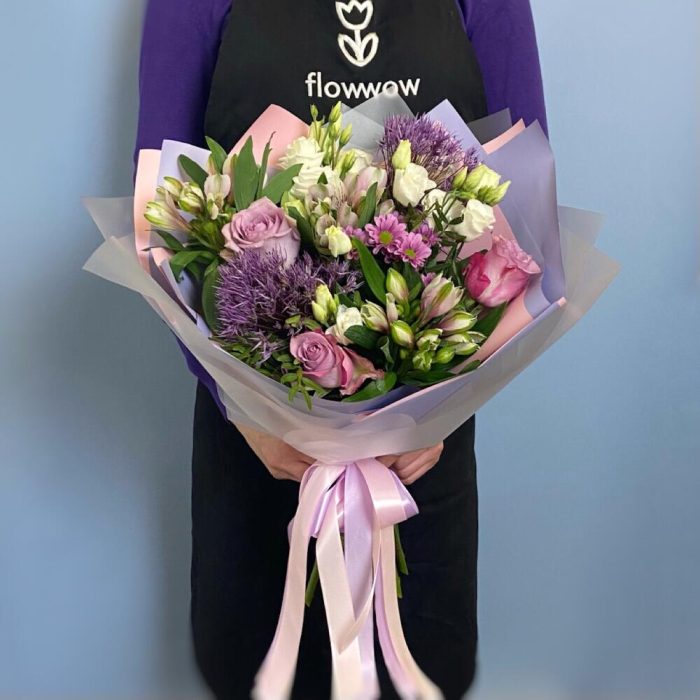 Альстромерия – 3 шт.Лизиантус – 2 шт.Лента атласная – 2 шт.Сантини – 1 шт.Фисташка – 3 шт.Аллиум – 2 шт.Упаковка дизайнерская – 2 шт.Роза премиум – 3 шт.