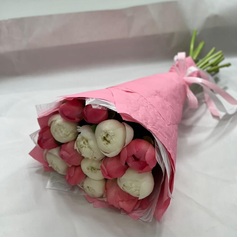 Пион Коралл Шарм (Coral Charm) – 8 шт.Упаковка – 2 шт.Лента атласная – 1 шт.Пион белый – 7 шт.