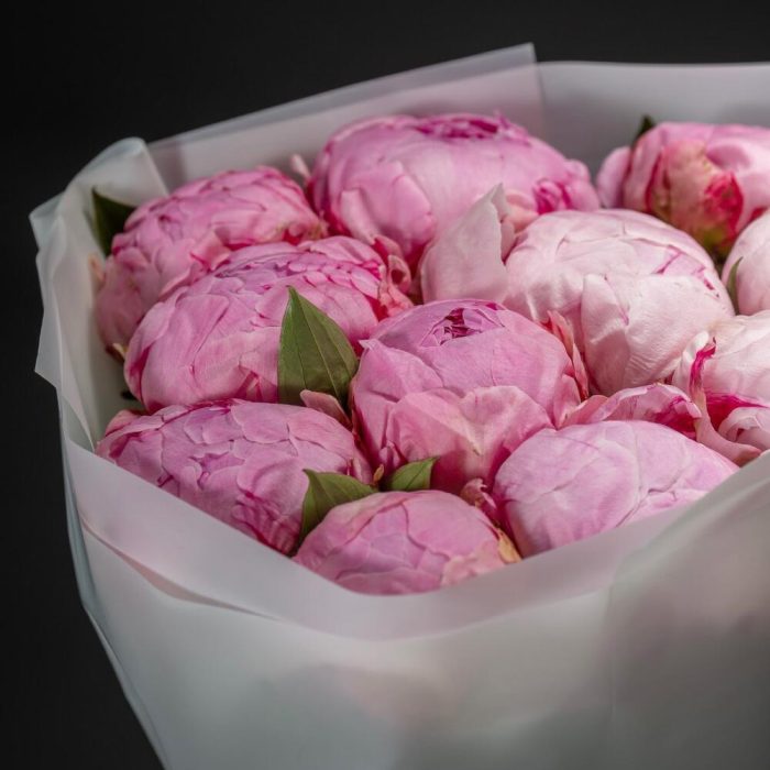 пионы розовые – 11 шт.Упаковка дизайнерская – 2 шт.Лента атласная – 2 шт.Открыточка с вашими пожеланиями – 1 шт.инструкция по уходу за цветами – 1 шт.хорошее настроение – 100 шт.