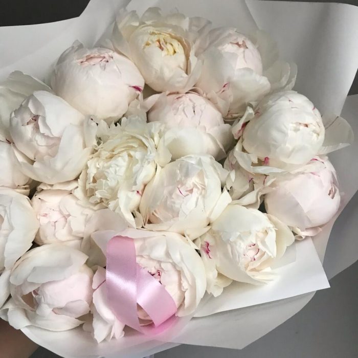 Лента – 3 шт.Пион белый – 15 шт.Упаковка дизайнерская – 5 шт.