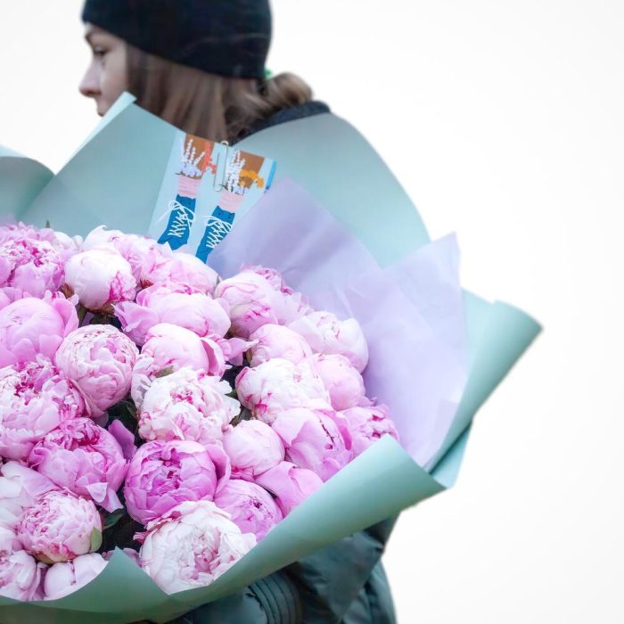 Лента атласная – 4 шт.Тишью – 4 шт.Упаковка дизайнерская – 1 шт.Пион розовый – 41 шт.Средство для продления жизни цветов – 2 шт.инструкция по уходу за цветами – 1 шт.