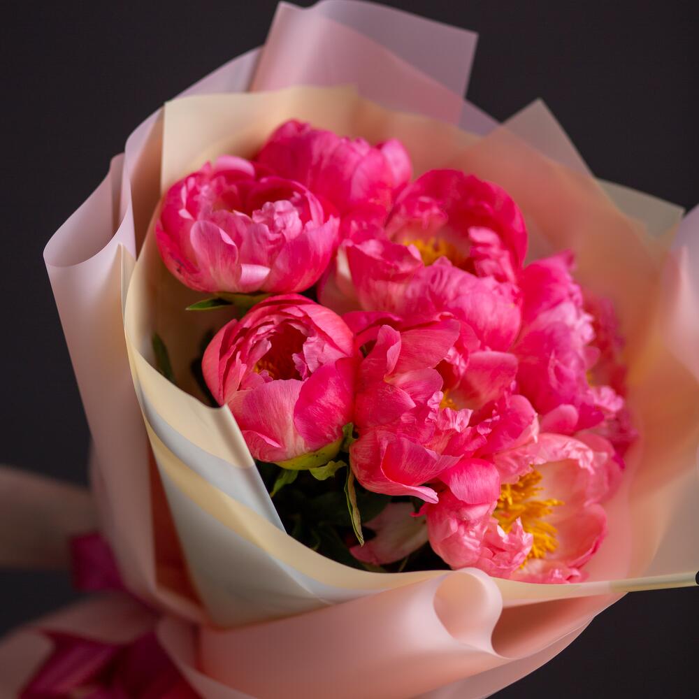 Пион coral sunset – 7 шт.Упаковка матовая – 1 шт.Лента атласная – 1 шт.