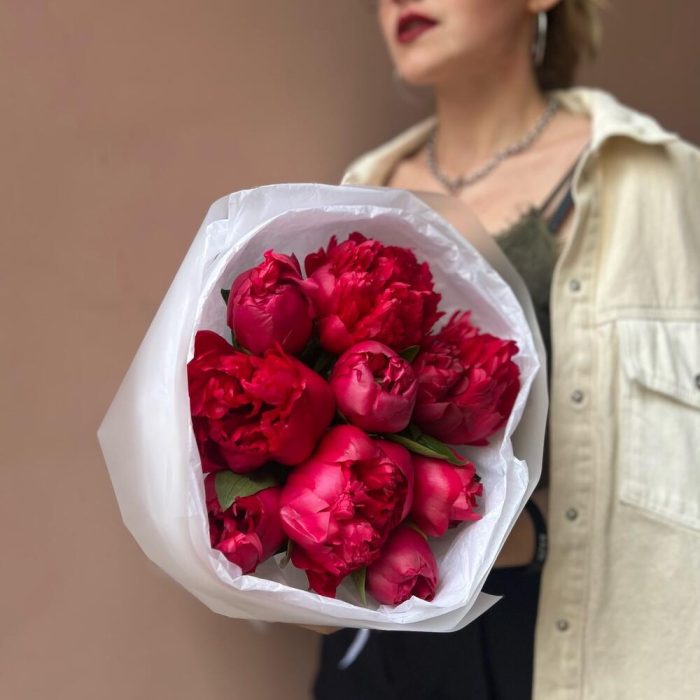 Лента атласная – 1 шт.Тишью – 3 шт.Пленка матовая – 1 шт.пион белгравия – 9 шт.