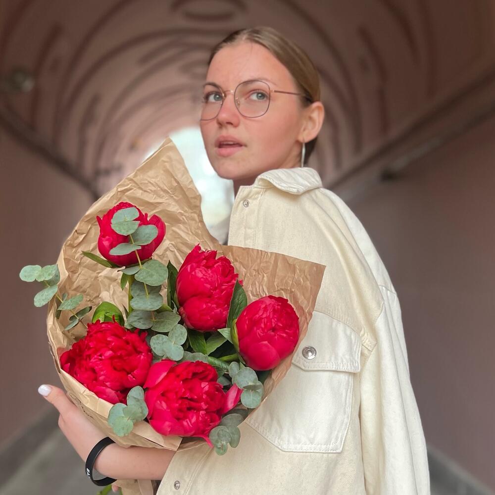 Эвкалипт – 1 шт.Лента атласная – 1 шт.Крафт – 1 шт.пион белгравия – 5 шт.