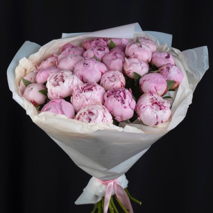 Пион розовый – 25 шт.Упаковка дизайнерская – 2 шт.Лента атласная – 2 шт.Открыточка с вашими пожеланиями – 1 шт.хорошее настроение – 100 шт.инструкция по уходу за цветами – 1 шт.коробка переноска – 1 шт.Кризал – 1 шт.