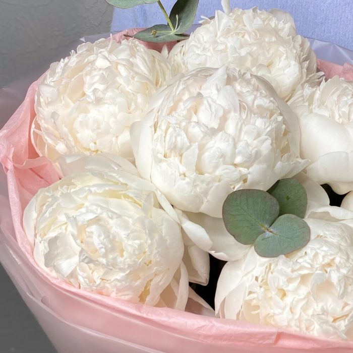 Лента атласная – 1 шт.Тишью – 4 шт.Упаковка дизайнерская – 1 шт.Эвкалипт пучок – 1 шт.пион белый премиум крупный бутон – 7 шт.