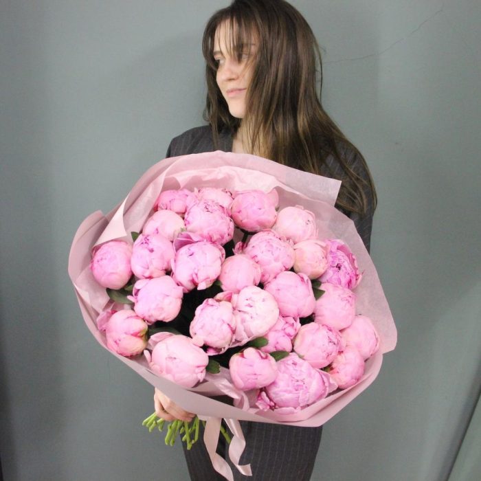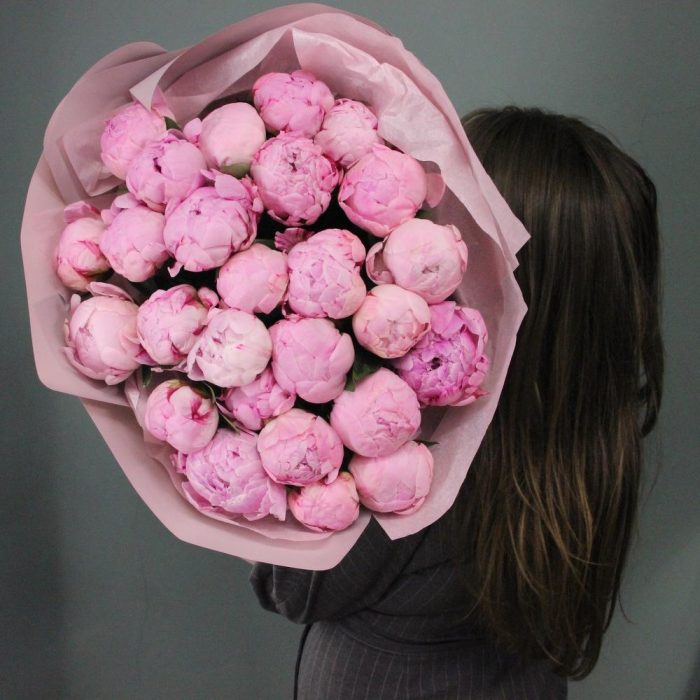Букет из 25 пионов в лаконичной упаковке.Стильное цветочное решение для любого случая.