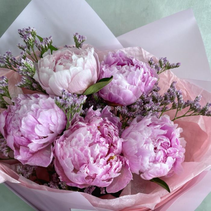 Лимониум – 2 шт.Пион – 5 шт.Упаковка тишью – 2 шт.Упаковка пленка матовая – 2 шт.