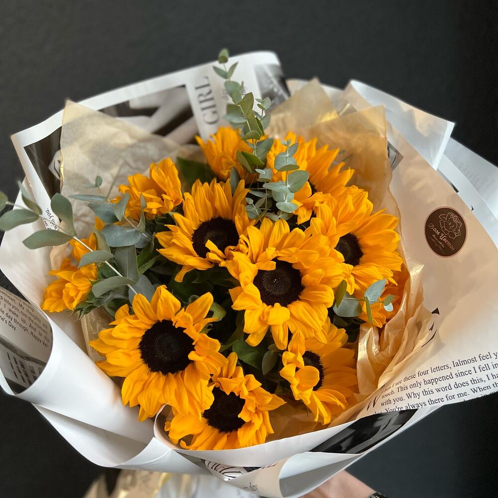 Подсолнух – 11 шт.Эвкалипт – 5 шт.декоративная упаковка – 1 шт.Атласная лента – 1 шт.