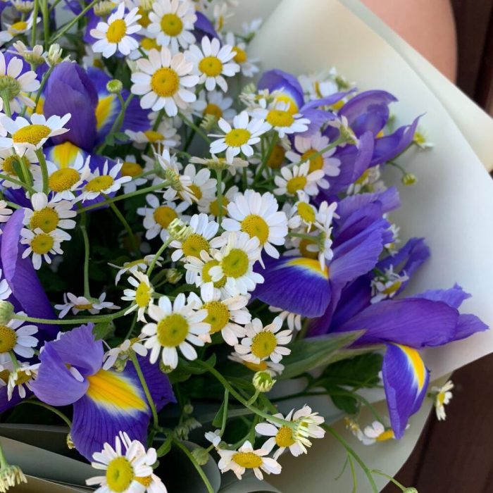 Ромашка кустовая – 6 шт.Ирис – 7 шт.Упаковка дизайнерская – 1 шт.Лента атласная – 1 шт.