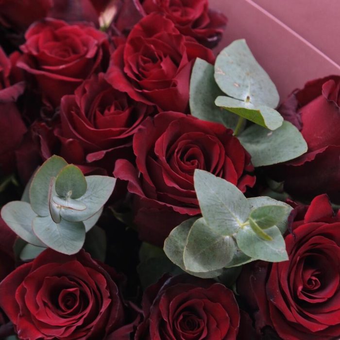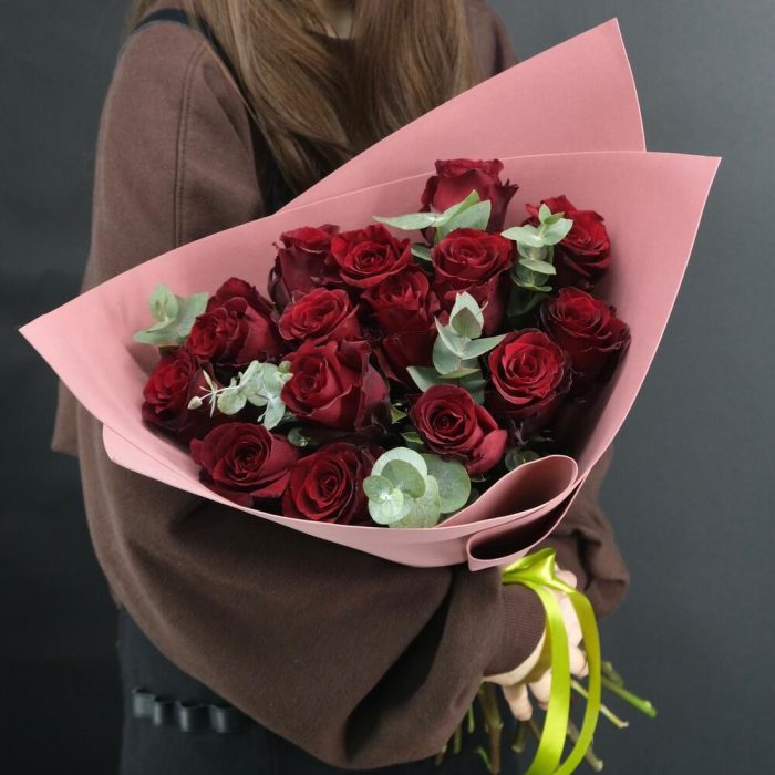 15 красных роз с веточками эвкалипта