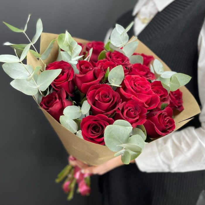 Роза эквадор 55 см – 19 шт.Эвкалипт – 5 шт.Крафт – 3 шт.