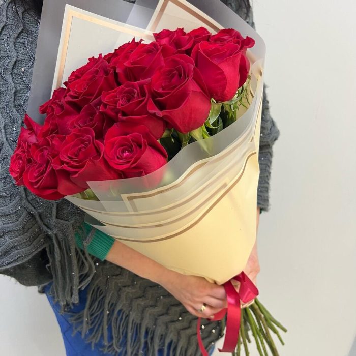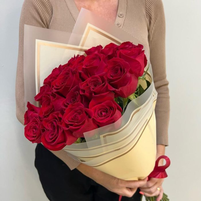 роза эквадор 60 см премиум – 21 шт.Лента атласная красная – 1 шт.Пленка дизайнерская – 2 шт.Роза Эквадор 60 см – 21 шт.