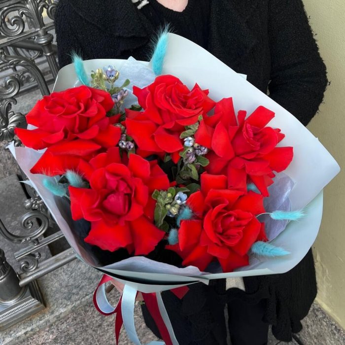 Лента атласная – 2 шт.Лагурус – 8 шт.Упаковка корейская пленка – 1 шт.твидия голубая – 4 шт.роза французская нина – 5 шт.тишью небесное – 1 шт.