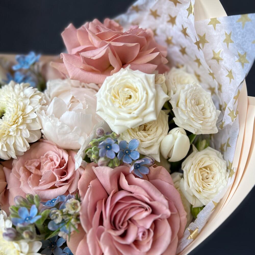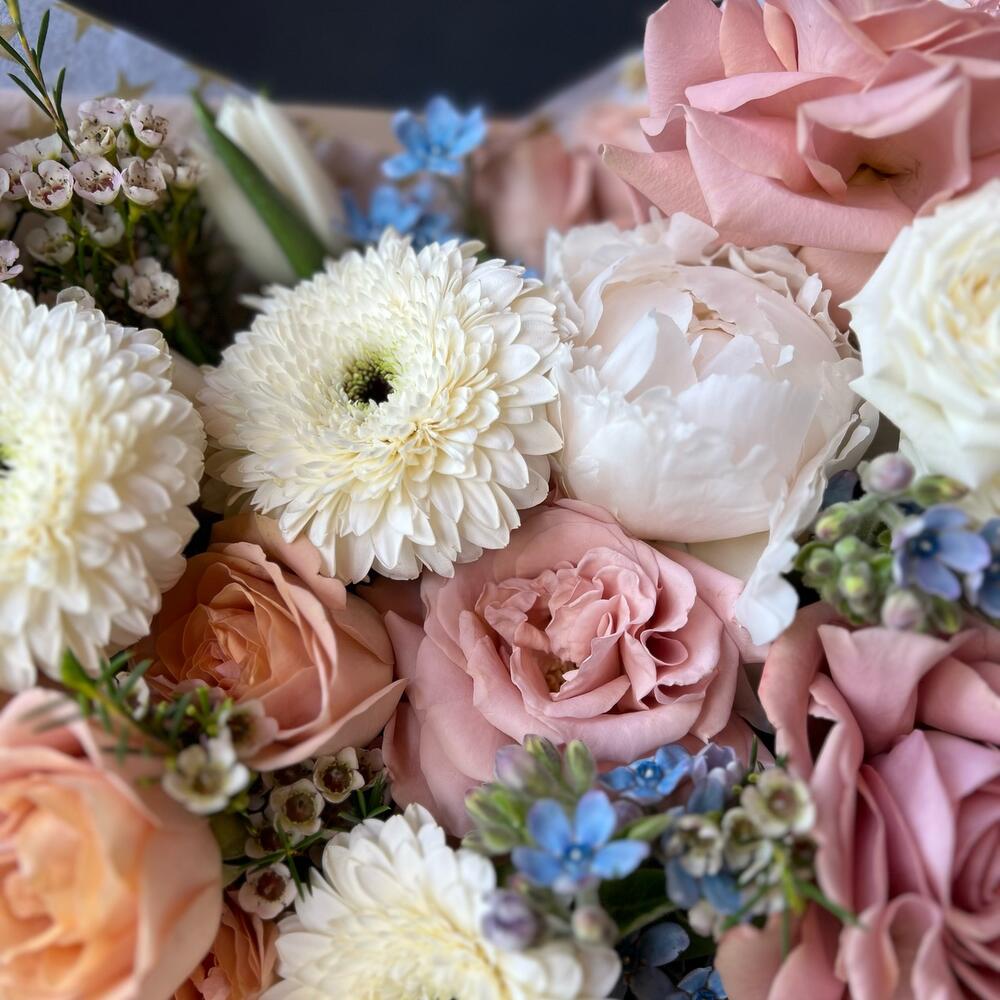 Авторский букет с пионовидными розами, пионом и Герберами «Айс латте»