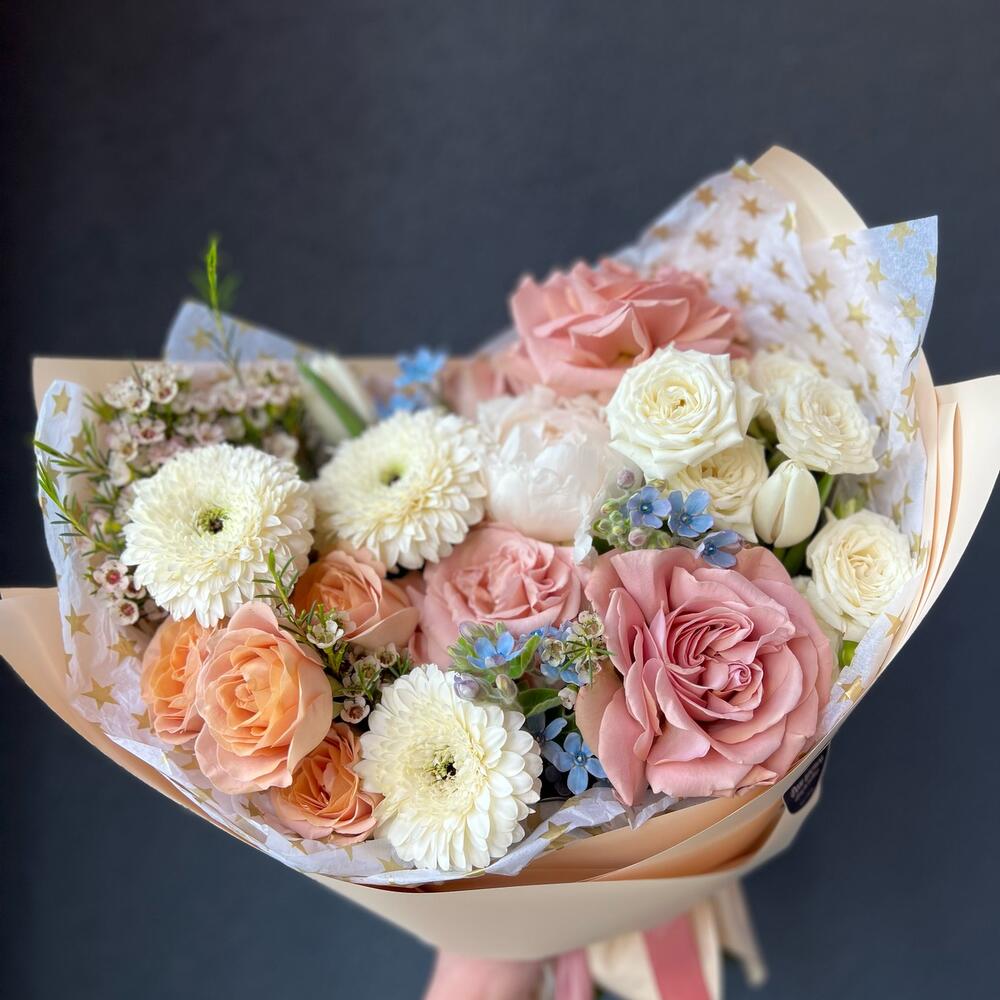 Пион – 1 шт.Тюльпан – 3 шт.Кустовая роза – 3 шт.Гербера – 3 шт.Хамелациум – 1 шт.Пионовидная роза – 3 шт.Оксипеталум – 3 шт.декоративная упаковка – 1 шт.Атласная лента – 1 шт.