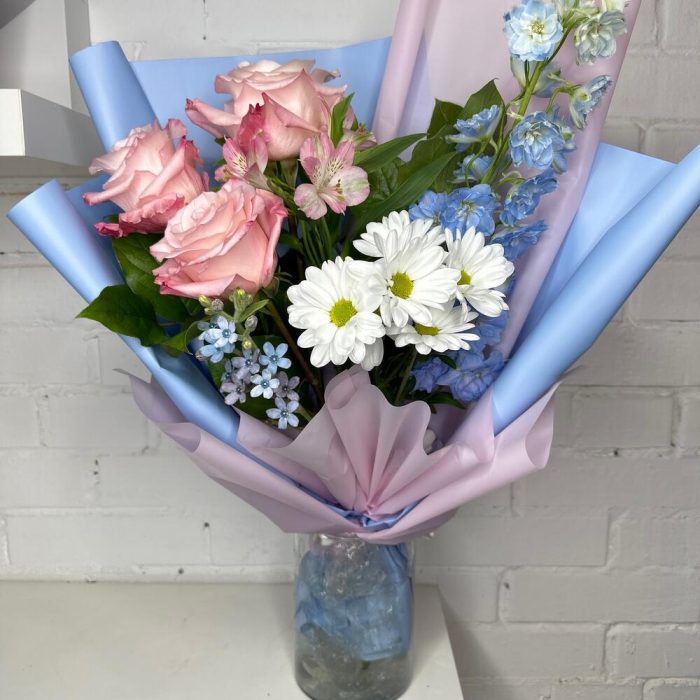 Роза Эквадор – 3 шт.Дельфиниум – 1 шт.Хризантема кустовая – 1 шт.Фисташка – 3 шт.Корейская упаковка – 3 шт.