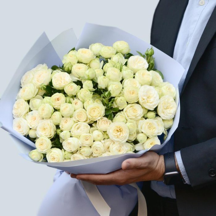 белые пионовидные розы – 21 шт. Упаковка дизайнерская – 3 шт. Лента атласная – 1 шт. Открыточка с вашими пожеланиями – 1 шт.