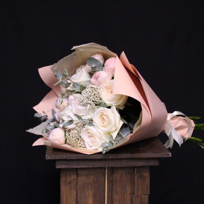 роза кустовая пионовидная mansfield park – 3 шт.роза пионовидная white o’hara – 6 шт.Озотамнус – 2 шт.Эвкалипт – 2 шт.Тишью – 2 шт.Пленка дизайнерская – 2 шт.Лента атласная – 1 шт.