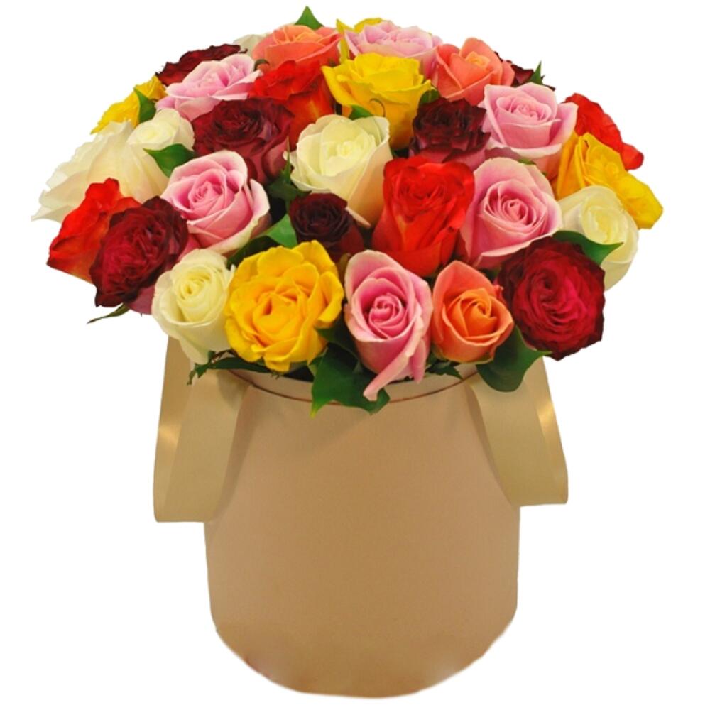 Букет из 15 роз MIX в шляпной коробке, длина 30см