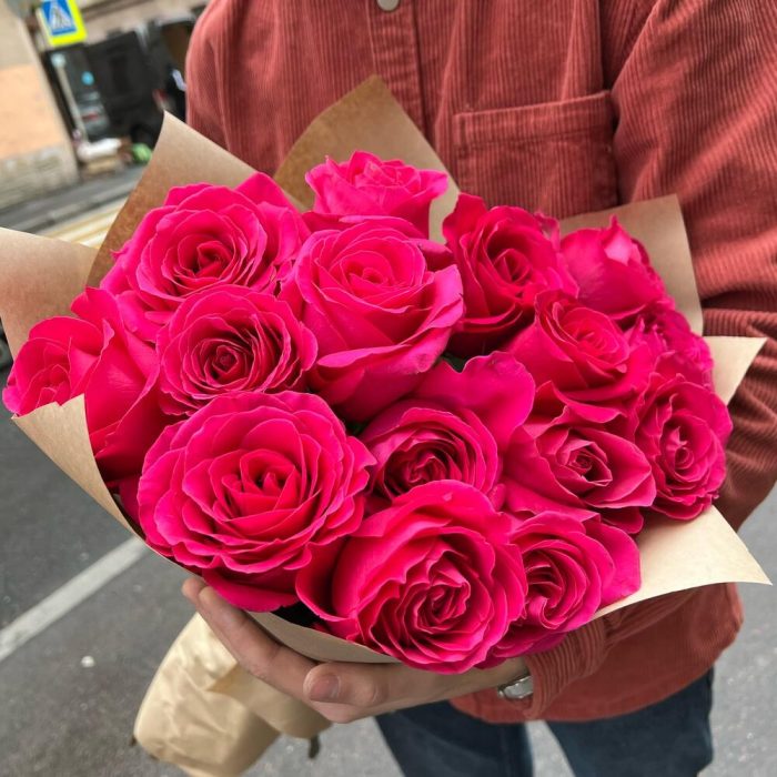 роза розовая ароматная Pink Floyd – 15 шт.Упаковка крафт – 2 шт.Лента атласная белая – 1 шт.